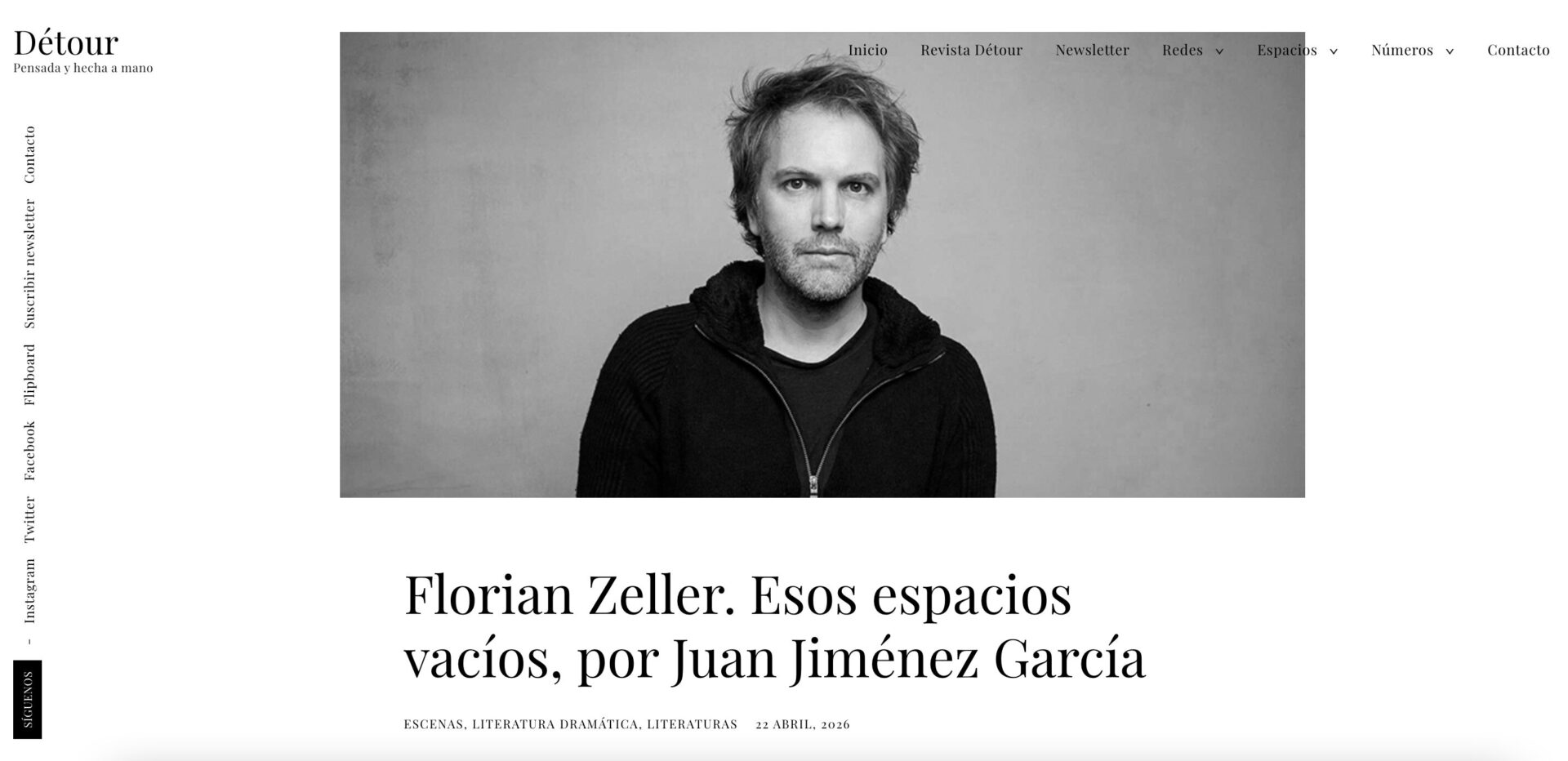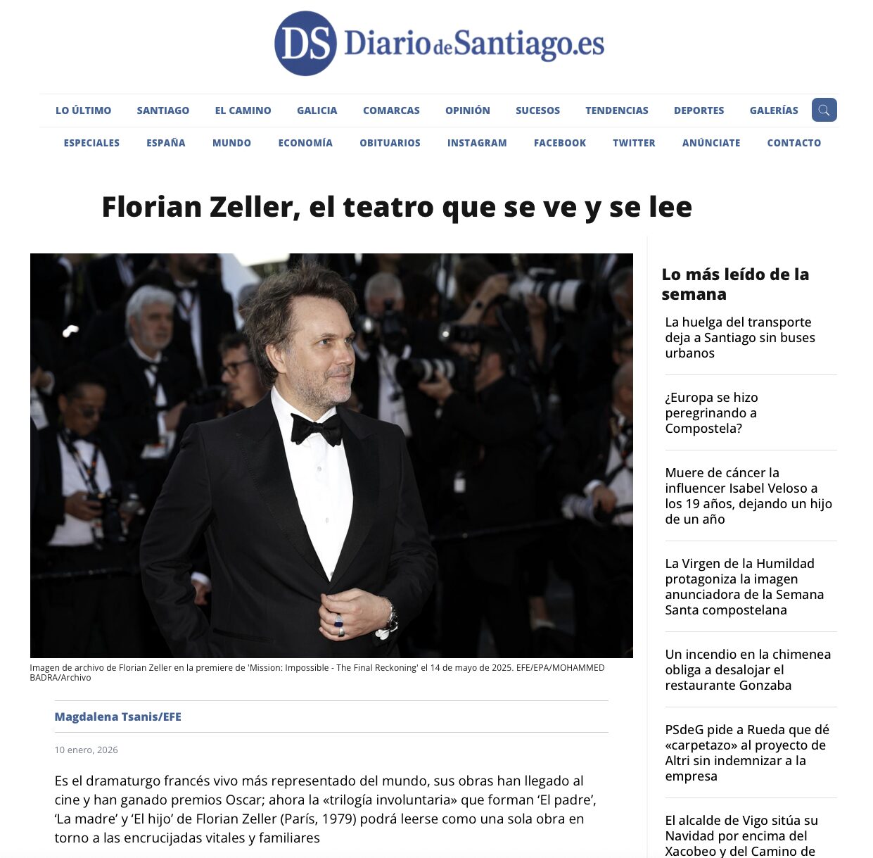 Florian Zeller, el teatro que se ve y se lee. (…) La trilogía ha sido vista en más de 45 países y sigue representándose. La adaptación cinematográfica de ‘El padre’ (2020) que dirigió el propio Zeller y que se adentraba en el laberinto del Alzheimer, le valió un Oscar a Anthony Hopkins como mejor actor y otro a Zeller por el guion adaptado. Ahora Hollywood se lo rifa. Hugh Jackman y Laura Dern protagonizaron ‘El hijo’ (2022), una obra que se estrenó en el Festival de Venecia y este mismo año Zeller, que también es libretista de ópera y miembro de la Academia Francesa de la lengua, rodará con Javier Bardem y Penélope Cruz. Por Magdalena Tsanis para Diario de Santiago | 10.01.2026