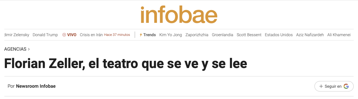 Florian Zeller, el teatro que se ve y se lee. Madrid, 10 ene (EFE).- Es el dramaturgo francés vivo más representado del mundo, sus obras han llegado al cine y han ganado premios Oscar; ahora la «trilogía involuntaria» que forman ‘El padre’, ‘La madre’ y ‘El hijo’ de Florian Zeller (París, 1979) podrá leerse como una sola obra en torno a las encrucijadas vitales y familiares. El próximo 21 de enero, la editorial De Conatus, que descubrió en España a Jon Fosse antes de que ganara el Nobel, publicará juntas estas tres piezas de un autor que considera «imprescindible» por su maestría al retratar a personajes al borde del colapso y con ello también reivindica el teatro como un género para ser leído. Por Magdalena Tsanis para Infobae | 11.01.2026