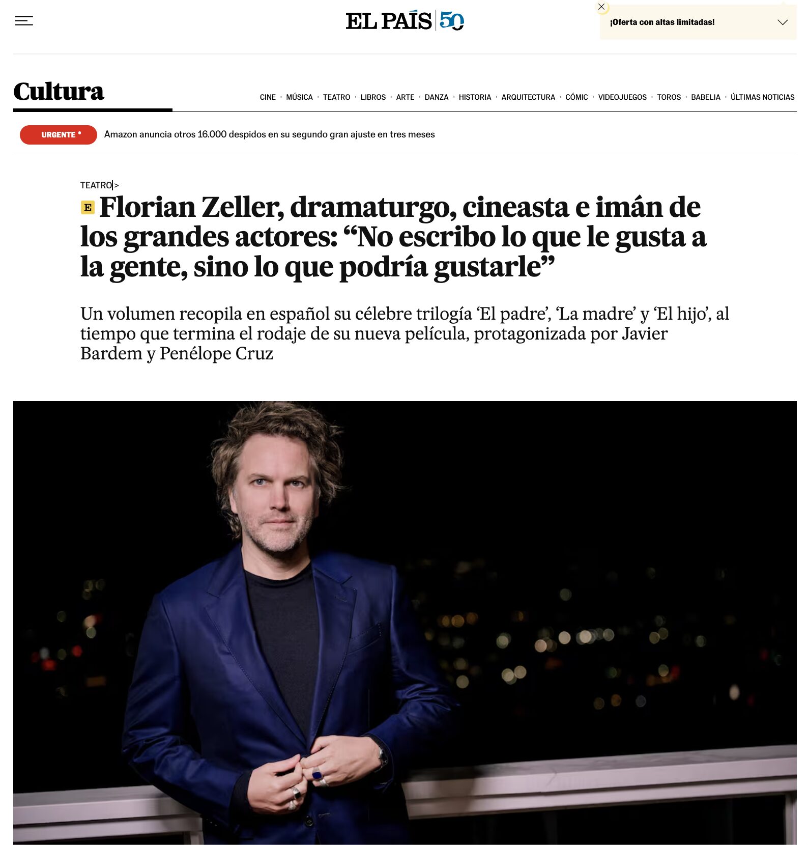 Florian Zeller, dramaturgo, cineasta e imán de los grandes actores: “No escribo lo que le gusta a la gente, sino lo que podría gustarle” Un volumen recopila en español su célebre trilogía ‘El padre’, ‘La madre’ y ‘El hijo’, al tiempo que termina el rodaje de su nueva película, protagonizada por Javier Bardem y Penélope Cruz Por Rodrigo Naredo para El País | 28.01.2026