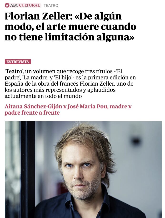 Florian Zeller: «De algún modo, el arte muere cuando no tiene limitación alguna» ENTREVISTA ‘Teatro’, un volumen que recoge tres títulos -‘El padre’, ‘La madre’ y ‘El hijo’- es la primera edición en España de la obra del francés Florian Zeller, uno de los autores más representados y aplaudidos actualmente en todo el mundo. Por JULIO BRAVO para ABC Cultural | 05/02/2026